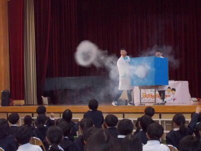 PTA教育講演会 投稿: 職員 (2025/11/19) 参観日後、PTA教育講演会がありました。 今年度は、松竹芸能所属の「ボルトボルズ」さんに素敵なサイエンスショーをしていただきました。 空気砲から出る空気の流れについて考える実験が特に盛り上がっていました。 Tweet -